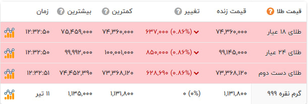 قیمت طلا 18 عیار البته با کاهش قیمت 63هزار 700 تومانی به گرمی 7 میلیون و 436 هزار تومان رسید. طلا 24 عیار نیز 85 هزار تومان کاهش را تجربه کرد و به قیمت 9 میلیون و 914 هزار و 500 تومان رسید.