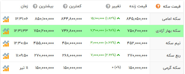 امروز نرخ سکه بهار آزادی با 730 هزار تومان افزایش به 75 میلیون و 20 هزار تومان رسید. همچنین سکه امامی با 1میلیون و 510 هزار تومان افزایش قیمت به 84 میلیون و 505 هزار تومان رسید.