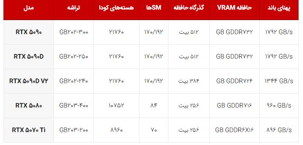 جدول مشخصات دقیق کارتهای سری RTX 50