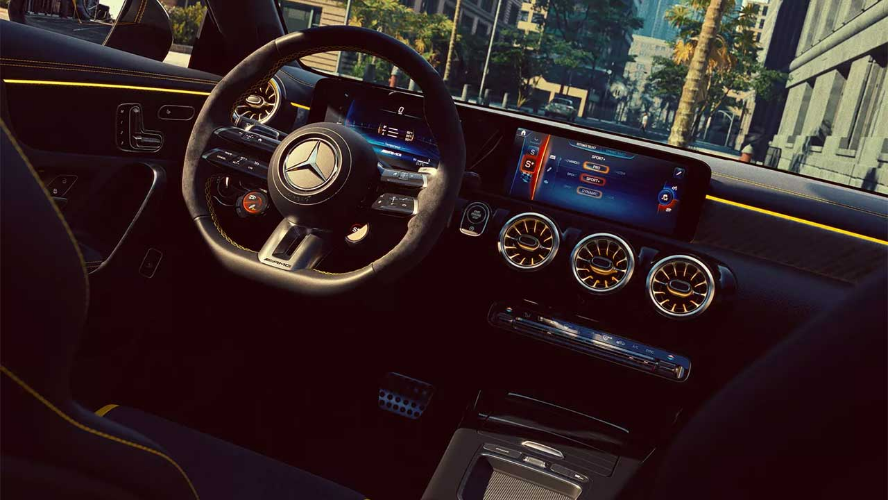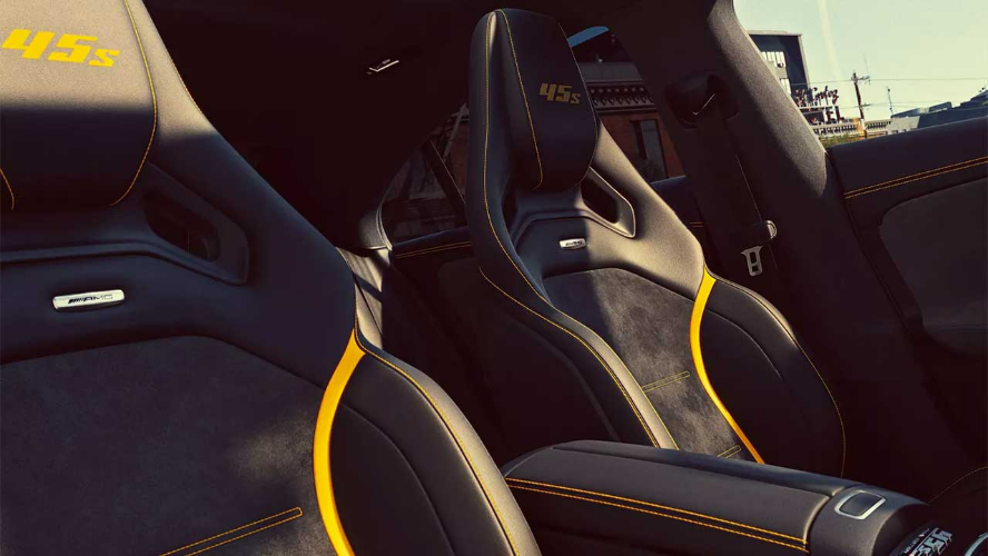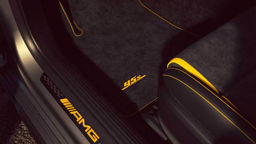این نسخهٔ ویژه همچنین به پکیجهای AMG نایت پلاس و AMG آیرودینامیک پلاس هم مجهز است که تزئینات مشکی براق و کروم مشکی، اسپویلر ثابت عقب، اسپلیتر بزرگتر و بالههای جلو را اضافه میکنند. کابین نیز فراموش نشده و خریداران از صندلیهای AMG پرفورمنس با روکش میکروفایبر مشکی بهرهمند خواهند شد. این صندلیها همچنین به دارای دوخت زرد متضاد و نوشتهٔ ۴۵ S روی پشتسریها هم مجهز هستند. جزئیات ویژه دیگر شامل فرمان AMG پرفورمنس با روکش چرم ناپا و میکروفایبر، کفپوشهای AMG با دوخت زرد و پلاکهای ورودی درخشان میشود. همچنین نشان «۴۵ S فاینال ادیشن» روی کنسول مرکزی خودنمایی میکند.