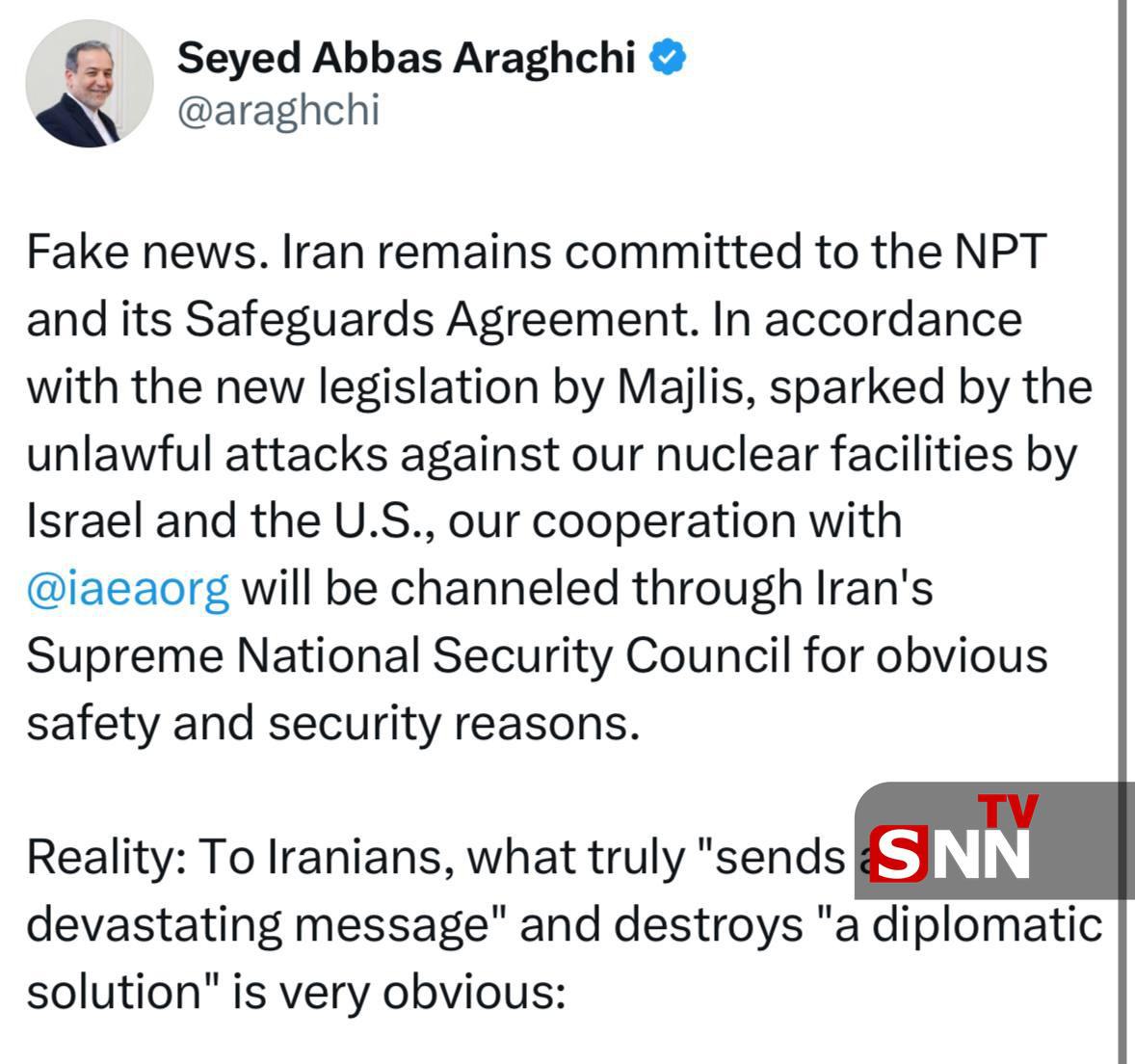 خبرگزاری دانشجو/ وزیر امورخارجه ایران در پاسخ به یک خبر جعلی اذعان کرد: ایران همچنان به معاهده عدم اشاعه و توافقنامه پادمان پایبند است. مطابق با قانون جدید مصوب مجلس شورای اسلامی، که در واکنش به حملات غیرقانونی علیه تأسیسات هستهای ایران توسط اسرائیل و ایالات متحده آمریکا تصویب شد، همکاری ایران با آژانس بینالمللی انرژی اتمی به دلایل بدیهی ایمنی و امنیتی، صرفا از طریق شورای عالی امنیت ملی جمهوری اسلامی ایران ساماندهی خواهد شد.