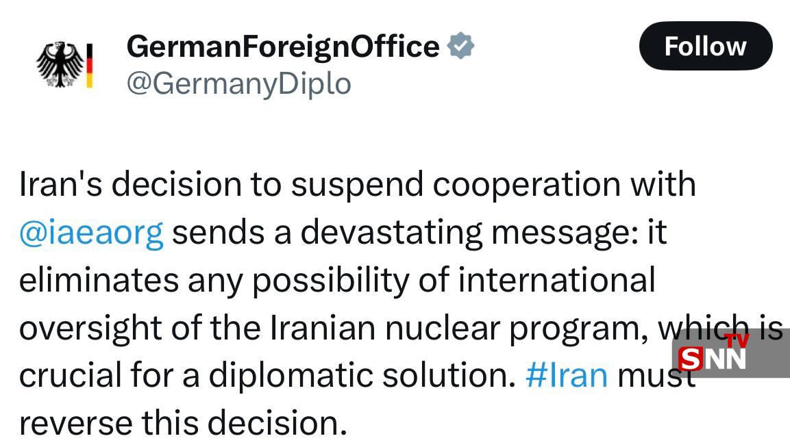 حمایت آشکار آلمان از حمله غیرقانونی اسرائیل به ایران، از جمله حمله به تأسیسات هستهای تحت پادمان، که آن را «کار کثیف» انجامشده به نیابت از غرب توصیف کردند. آلمان همچنین با وقاحت از حمله غیرقانونی آمریکا به تأسیسات هستهای ایران حمایت کرد؛ حملهای که ناقض حقوق بینالملل، معاهده عدم اشاعه و منشور سازمان ملل بود.