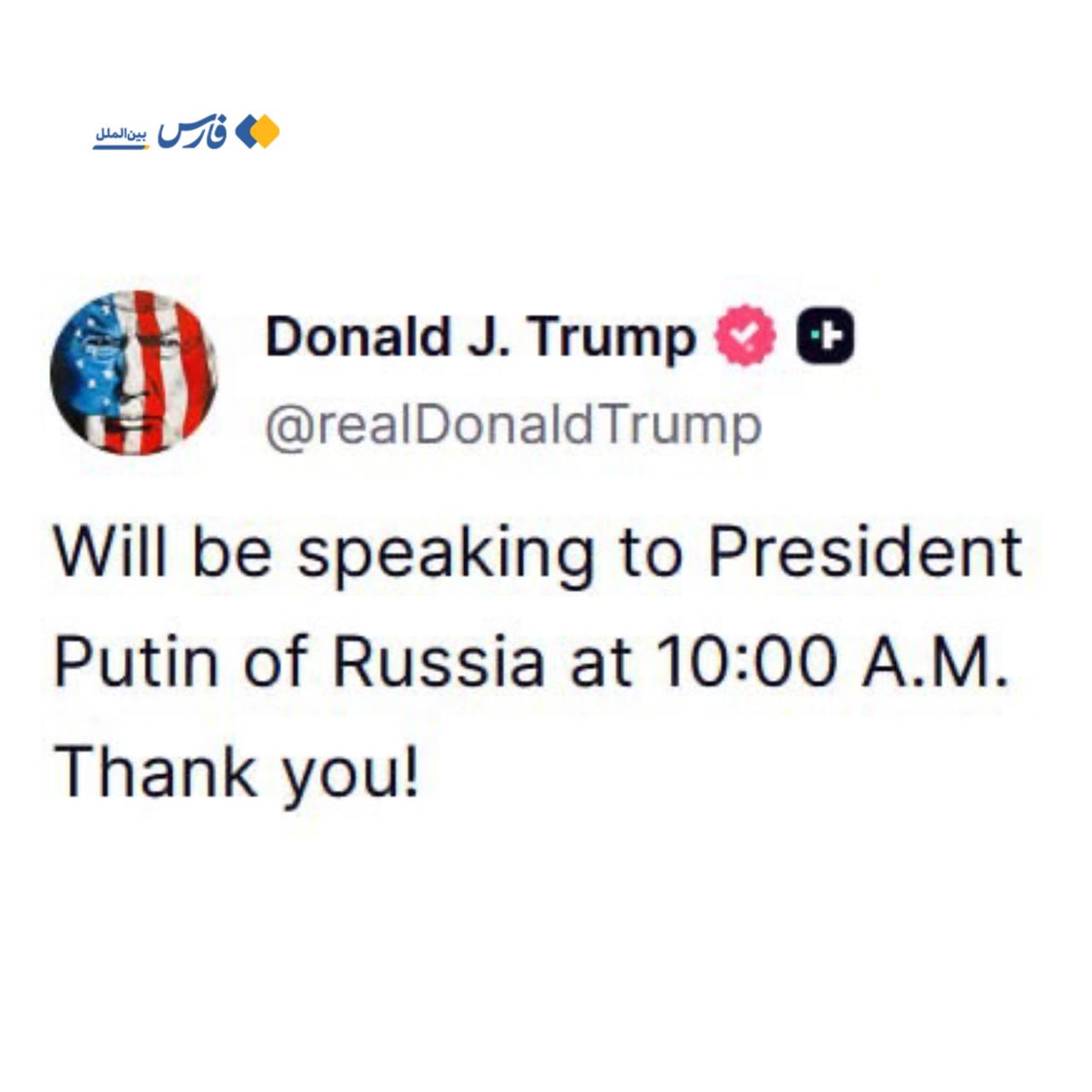 ایسنا/ دونالد ترامپ اعلام کرد که ظرف دقایق آینده با ولادیمیر پوتین تلفنی گفتوگو خواهد کرد.