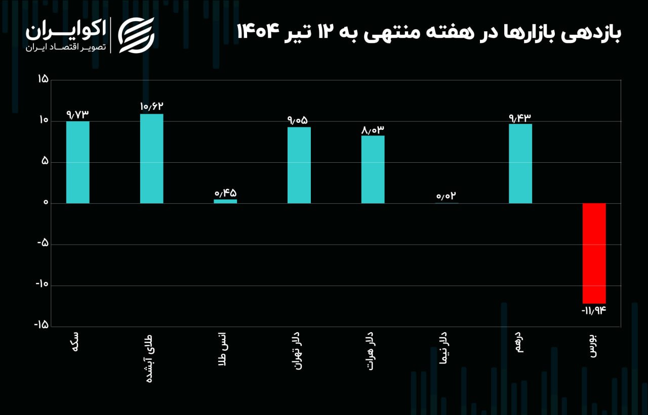 بازار طلا و ارز آزاد در هفته منتهی به 12 تیر سبزپوش بودند و همگی بازدهی بالای 8 درصد را به ثبت رساندند. عطش نوسان بازار طلا و ارز که در انتهای هفته گذشته با خبر آتشبس میان ایران و اسرائیل گرفته شده بود با ورود به هفته جدید دوباره نوسانی دنبال شدند.