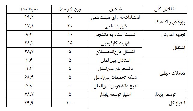 رتبه دانشگاه با وجود رشد ۶ واحدی امتیاز دانشگاه نسبت به قبل و کسب بیشترین امتیاز در سالهای گذشته با افت ۳۲ پلهای مواجه شده است. امید است این روند رشد امتیاز در صورت پایداری به بهبود رتبه دانشگاه نیز در سالهای آینده منجر شود. رتبهبندی QS هر سال دانشگاهها را بر اساس شاخصهایی ارزیابی میکند که شاهد تغییراتی جزئی در شاخص و وزن مربوط به آن هستیم. در جدول زیر وزن و نمره دانشگاه صنعتی شریف در هر یک از شاخصها نشان داده شده است.
