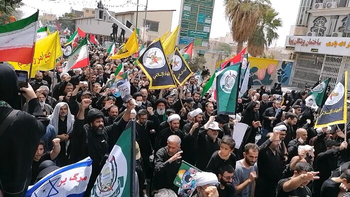 در مسیر تشییع، پرچمهای یا حسین (ع)، ایران، فلسطین و حزبالله لبنان در دست عزاداران به اهتزاز درآمده بود؛ گویی همپیمانی دوباره با جبهه حق. تصاویر سردار ایزدی و رهبر معظم انقلاب، چون نشانههایی از وفاداری و ولایتمداری، در دستان مردم میدرخشید.