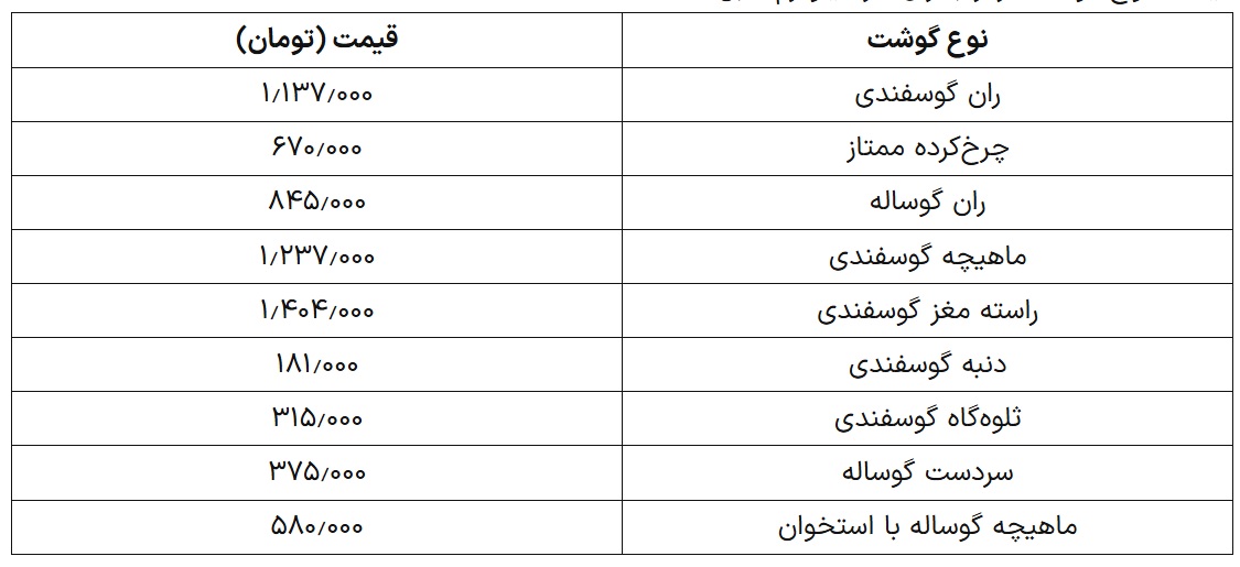 بر اساس دادههای منتشر شده، ران گوسفندی با قیمت یک میلیون و ۱۳۷ هزار تومان در اختیار مصرفکننده قرار میگیرد. چرخکرده ممتاز ۶۷۰ هزار تومان و ران گوساله ۸۴۵ هزار تومان قیمتگذاری شدهاند. در جدول زیر قیمت انواع گوشت قرمز بهازای هر کیلوگرم قابل مشاهده است.