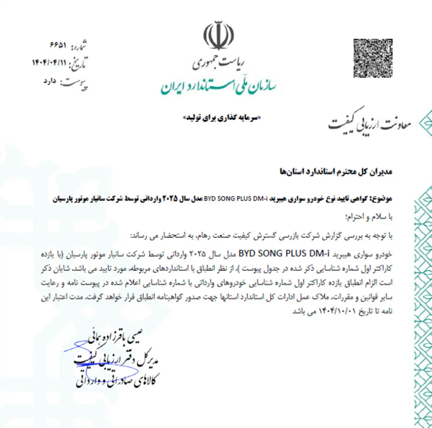 / بر اساس نامه منتشر شده از سازمان استاندارد ایران، تاییدیه استاندارد سانگ پلاس تیگارد موتور صادر شده و این کراس اوور به زودی به بازار می آید.