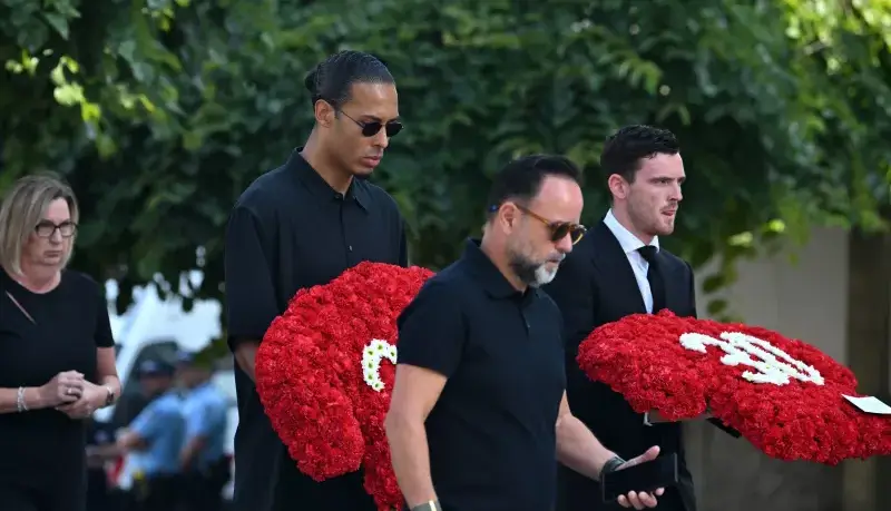 بازیکنان لیورپول در حالی که دو تاج گل برای ادای احترام به دیوگو ژوتا و برادر فقیدش حمل میکردند، در بدو ورود به مراسم خاکسپاری مورد تشویق حاضران قرار گرفتند که برای همراهی با خانواده و دوستان این دو برادر در محل مراسم تشییع حاضر شده بودند.