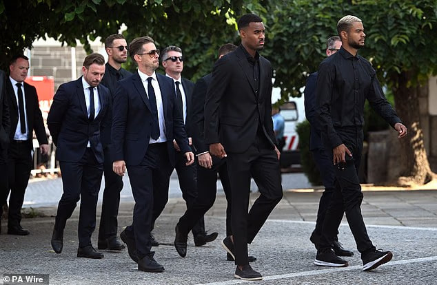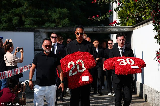بازیکنان لیورپول در حالی که دو تاج گل برای ادای احترام به دیوگو ژوتا و برادر فقیدش حمل میکردند، در بدو ورود به مراسم خاکسپاری مورد تشویق حاضران قرار گرفتند که برای همراهی با خانواده و دوستان این دو برادر در محل مراسم تشییع حاضر شده بودند.