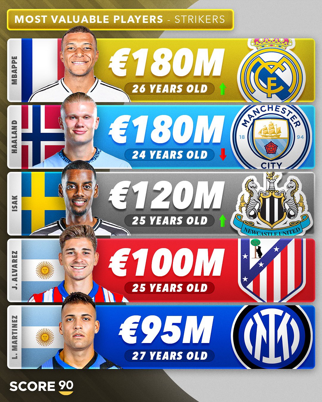 در صدر این فهرست، نام کیلیان امباپه و ارلینگ هالند، ستارگان رئال مادرید و منچسترسیتی دیده میشود. امباپه پس از افت عملکرد در نیمهی اول فصل ۲۵-۲۰۲۴ که منجر به کاهش قیمت او شد، در نیمفصل دوم فوقالعاده کار کرد و در نهایت فاتح کفش طلای اروپا و جایزهی پیچیچی شد. از طرفی، هالند که تا مقطعی از فصل ۲۰۰ میلیون یورو ارزش داشت، موازی با نتایج بد سیتی، با کاهش ۲۰ میلیون یورویی قیمت خود مواجه شده، اما همچنان در کنار امباپه، ارزشمندترین شمارهی ۹ جهان محسوب میشود.