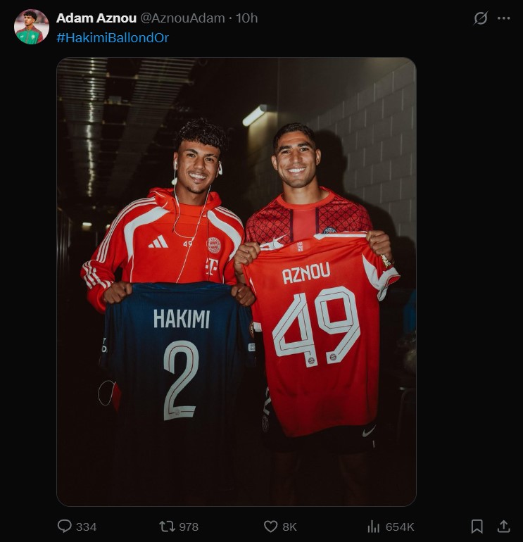 پس از پایان بازی دیشب، آدام آزنو، مدافع مراکشی و 19 سالهٔ بایرن مونیخ، تصویری از خودش در کنار اشرف حکیمی را به اشتراک گذاشت و در توضیح آن، از برچسب HakimiBallondOr# به معنای لایقبودن مدافع پاری سن ژرمن برای دریافت توپ طلا استفاده کرد. در ساعات اخیر، این هشتگ به یک ترند فراگیر در شبکههای اجتماعی تبدیل شده و کاربران زیادی عنوان کردهاند که توپ طلای 2025 باید به اشرف حکیمی اهدا شود.