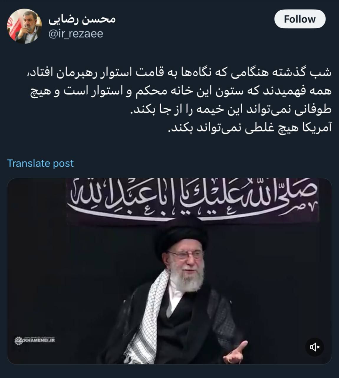 محسن رضایی عضو مجمع تشخیص مصلحت نظام در صفحه شخصیاش نوشت: شب گذشته هنگامی که نگاهها به قامت استوار رهبرمان افتاد، همه فهمیدند که ستون این خانه محکم و استوار است و هیچ طوفانی نمیتواند این خیمه را از جا بکند. آمریکا هیچ غلطی نمیتواند بکند.