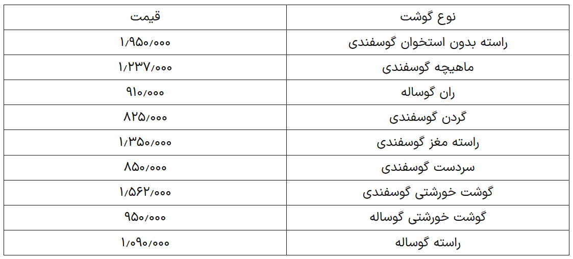 جدول زیر قیمت انواع گوشت قرمز را بهازای هر کیلوگرم در فروشگاههای سطح شهر نشان میدهد.