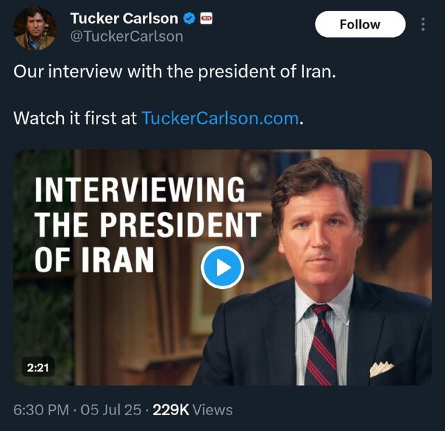 متن پیام مهدی طباطبایی در پیامرسان ایکس به شرح زیر است: «مصاحبه مهم رئیس جمهور با تاکر کارلسون روز پنجشنبه گذشته برگزار و بهزودی منتشر خواهد شد. این مصاحبه بعد از انتشار، در اختیار رسانههای داخلی گذاشته میشود. آنچه در برخی رسانهها با این عنوان منتشر شده، نادرست و مربوط به مصاحبه دکتر پزشکیان با تلویزیون روسیه در ماههای گذشته است.»