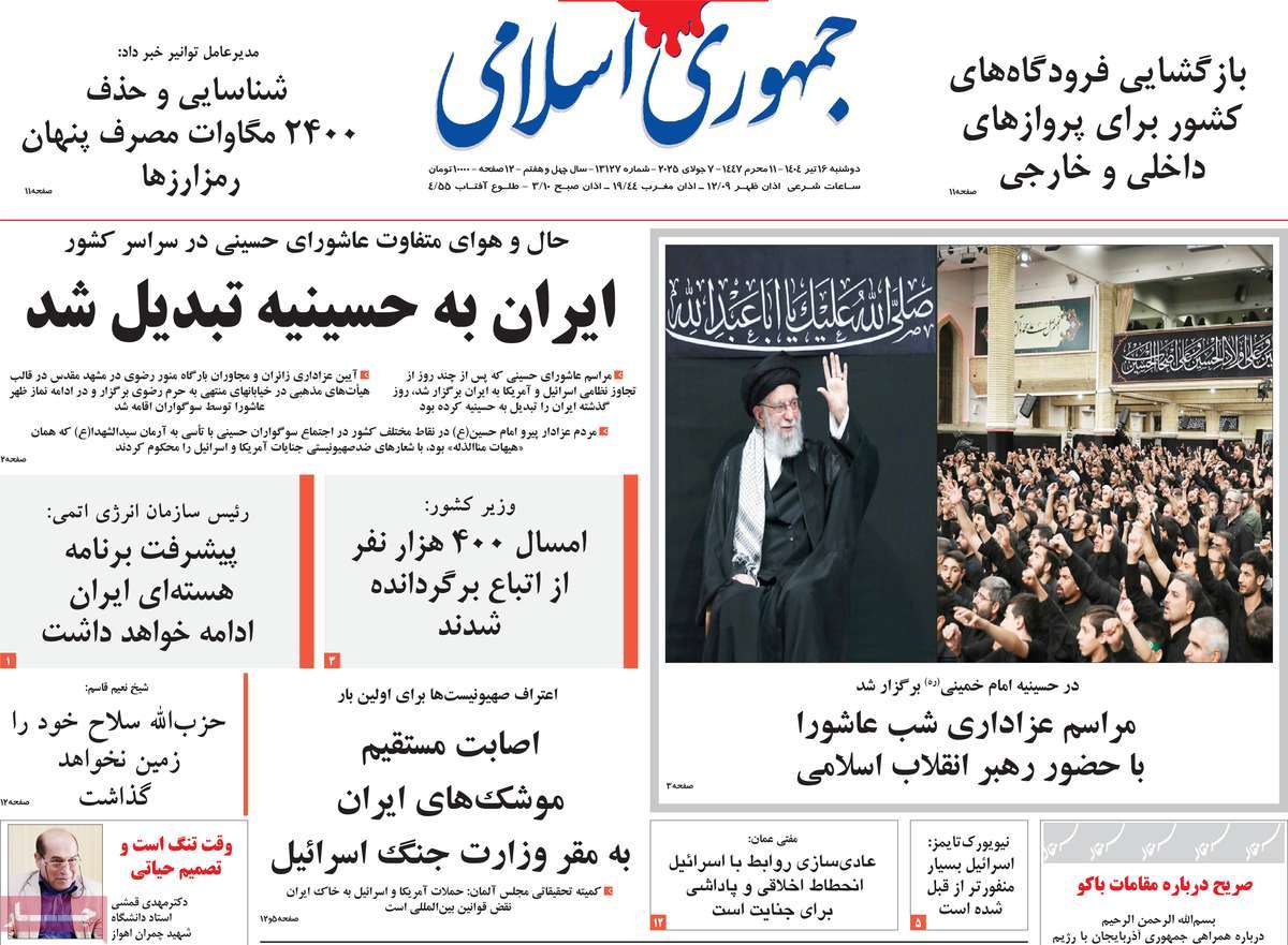 صفحه اول روزنامه جمهوری اسلامی دوشنبه ۱۶ تیر