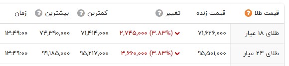 در بازار نرخ هر گرم طلای 18 عیار با 274 هزار تومان کاهش و با نرخ هفت میلیون و 162 هزار تومان در بازار طلا معامله شد. سکه امامی با 4 میلیون و 590 هزار تومان کاهش به 79 میلیون و 895 هزار تومان قیمت گذاری شد. سکه بهار آزادی با 2 میلیون و 15 هزار تومان کاهش به 72 میلیون و 780 هزار تومان رسید. نرخ نیم سکه و ربع سکه به ترتیب 44 میلیون و 200 هزار تومان و 25 میلیون و 300 هزار تومان در تابلو اعلان قیمتها نمایان شد.