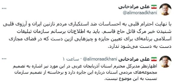 مرادخانی در توییتی نوشت: «با نهایت احترام قلبی به احساسات ضد استکباری مردم نازنین ایران و آرزوی قلبی شنیدن خبر مرگ قاتل حاج قاسم، باید به اطلاعتان برسانم سازمان تبلیغات اسلامی برنامهای برای تعیین جایزه و چیزهایی از این دست که در فضای مجازی دستبهدست میشود ندارد.»