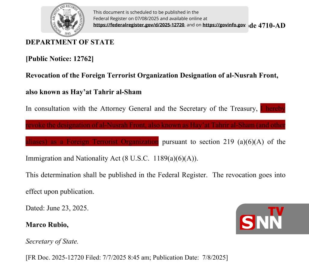 طبق اعلامیه منتشر شده در روزنامه رسمی فدرال آمریکا (که قرار است فردا به صورت رسمی منتشر شود) وزارت خارجه آمریکا از خروج جبهه النصره، هیئت تحریر الشام، از فهرست سازمانهای تروریستی خبر داد.در این اطلاعیه آمده است: «با مشورت دادستان کل و وزیر خزانهداری، بدین وسیله، عنوان سازمان تروریستی خارجیِ جبهه النصره، همچنین معروف به هیئت تحریر الشام (و سایر نامهای مستعار) را طبق بخش 219 (a)(6)(A) از قانون مهاجرت و ملیت لغو میکنم.» طبق این متن که توسط وزیر خارجه آمریکا مارکو روبیو در تاریخ ۲۳ ژوئن ۲۰۲۵ ثبت شده است، قرار است این حکم پس از انتشار «لازمالاجرا» شود و تاریخ انتشار آن نیز فردا هشتم جولای ثبت شده است.