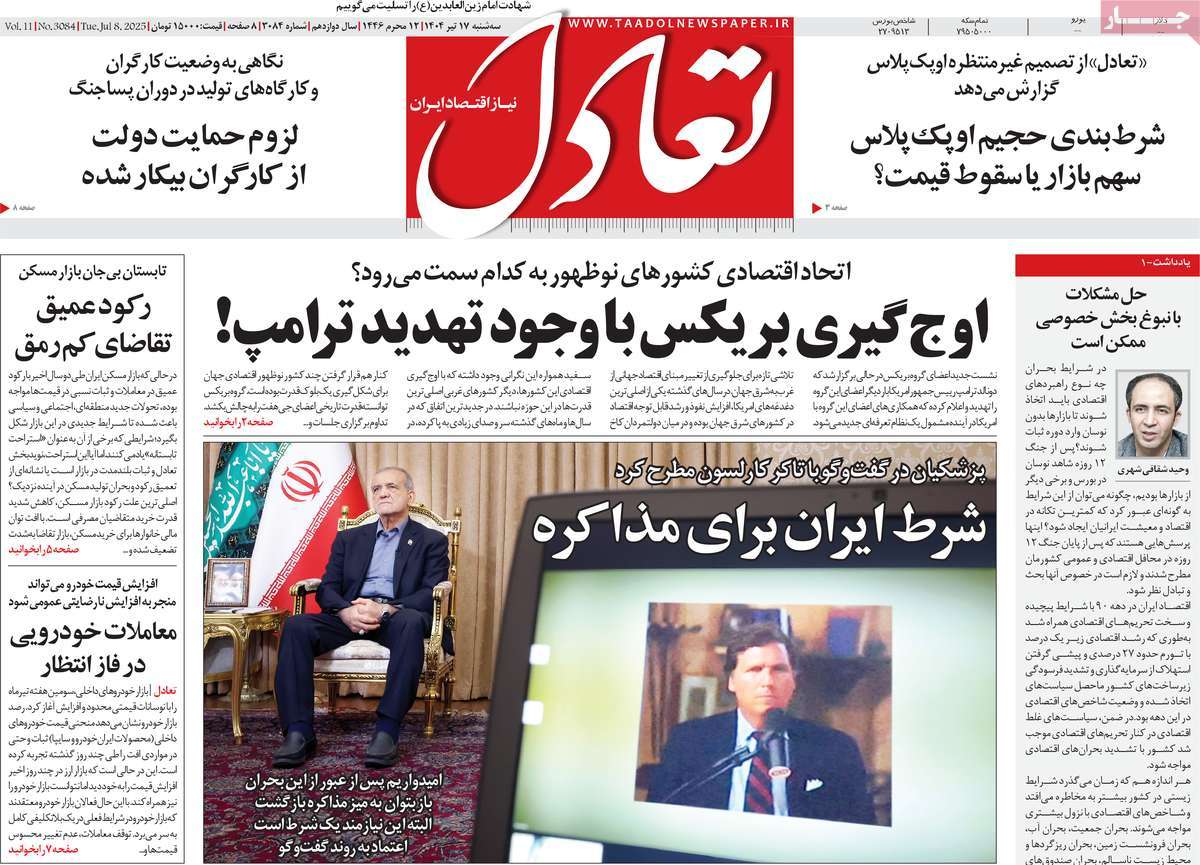 صفحه اول روزنامه تعادل سه‌شنبه ۱۷ تیر
