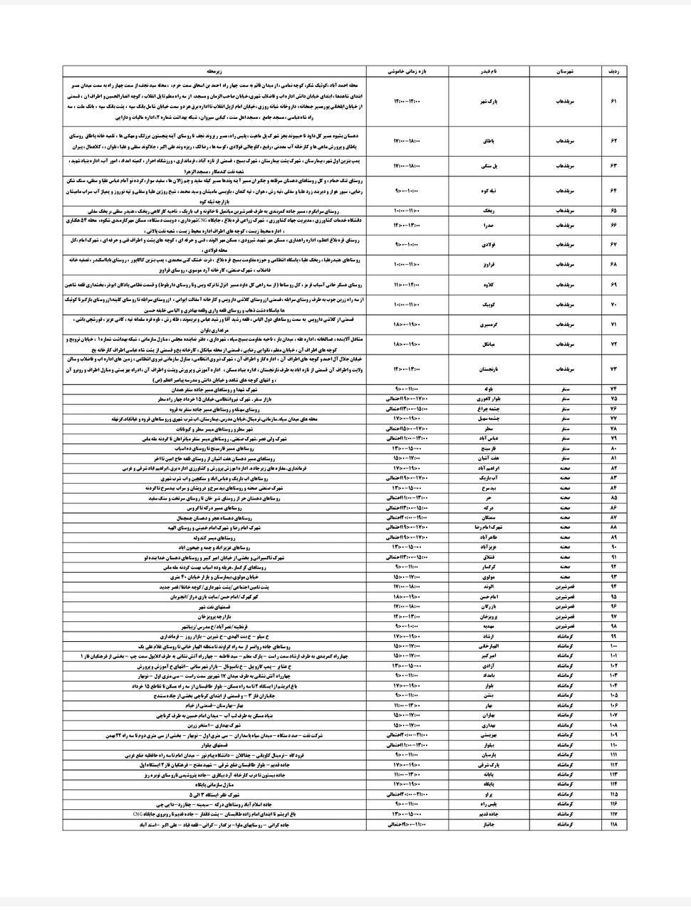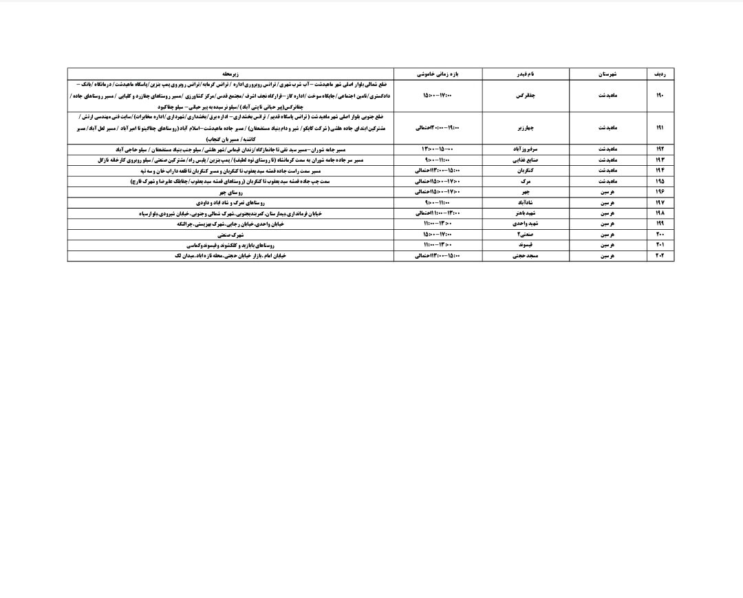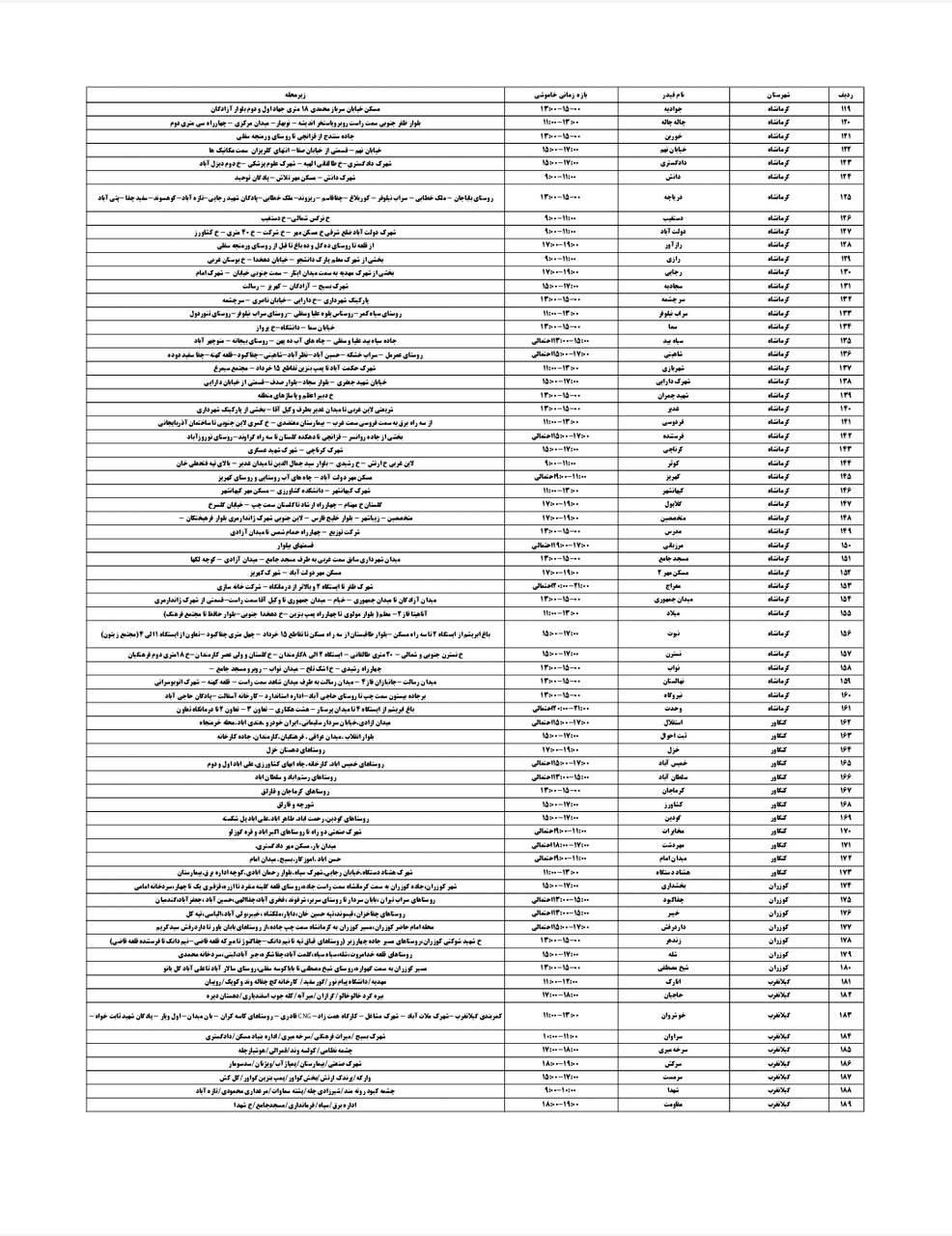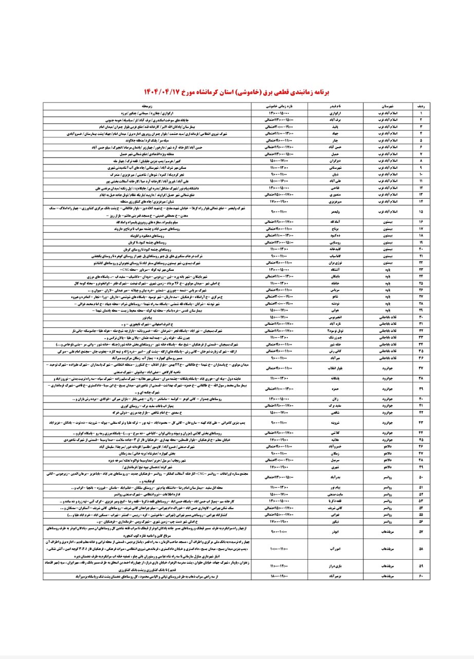 شرکت توزیع برق استان کرمانشاه طی جدولی، زمانبندی قطعی برق در مناطق مختلف استان کرمانشاه را برای امروز _سهشنبه هفدهم تیر_ اعلام کرد.