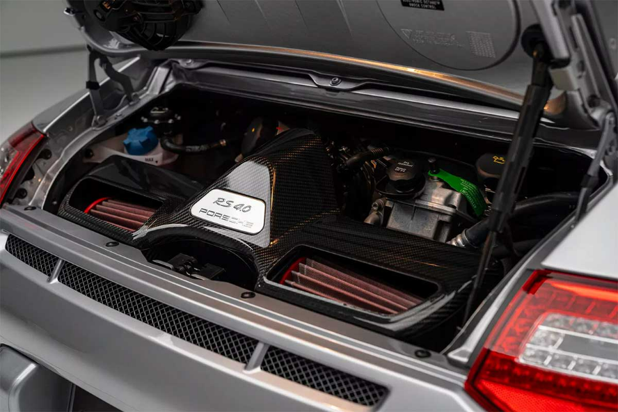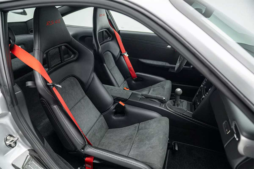 درواقع، این یکی از تنها ۳۹ دستگاهی است که با رنگ سفارشی عرضه شده است. رنگ نقرهای GT شاید چندان چشمگیر نباشد، اما بسیار چشمنواز است. در کنار رنگ نقرهای GT، گرافیکهای مشکی معمول GT3 RS 4.0 با تزئینات قرمز برجسته دیده میشود. آینههای بغل نیز به رنگ مشکی و قرمز هستند. این خودرو روی رینگهای تکپیچ مشکی خیرهکنندهای قرار دارد که پشت آنها کالیپرهای ترمز طلاییرنگ خودنمایی میکنند. کابین نیز با چرم مشکی و آلکانتارا، کمربندهای ایمنی قرمز و دستگیرههای در قرمز تزئین شده است.