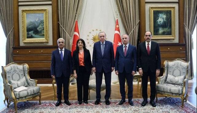 «رجب طیب اردوغان» رئیسجمهور ترکیه دوشنبه با «برفین بولدان» و «مدحت سنجار»، نمایندگان پارلمان از حزب برابری و دموکراسی خلقها با حضور «افکان آلا» شخصیت برجسته حزب حاکم عدالت و توسعه و «ابراهیم کالین» رئیس اطلاعات ترکیه دیدار کرد.