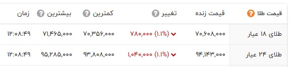 در بازار نرخ هر گرم طلای 18 عیار با 78 هزار تومان کاهش و با نرخ هفت میلیون و 60 هزار تومان در بازار طلا معامله شد. سکه امامی با 1 میلیون و 15 هزار تومان کاهش به 78 میلیون و 490 هزار تومان قیمت گذاری شد. سکه بهار آزادی با 675 هزار تومان کاهش به 71 میلیون و 505 هزار تومان رسید. نرخ نیم سکه و ربع سکه به ترتیب 43 میلیون و 500 هزار تومان و 24 میلیون و 800 هزار تومان در تابلو اعلان قیمتها نمایان شد.