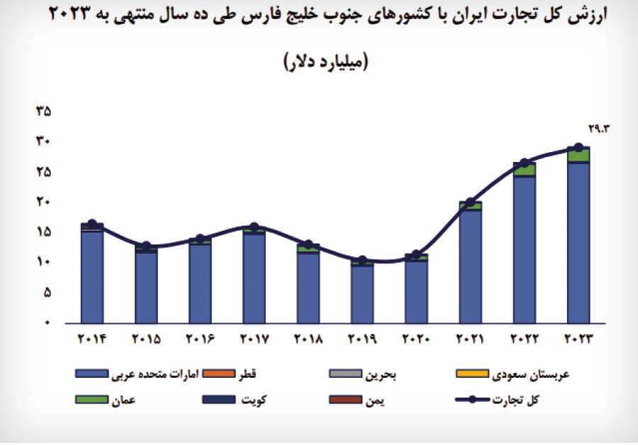 بررسی ها نشان می دهد در حال حاضر تجارت در منطقه خلیج فارس برای اقتصاد ایران عملاً به معنای تجارت با امارات است که همین موضوع نشان دهنده توسعه نامتوازن تجاری با کشورهای این ناحیه به شمار می رود. بررسی های اتاق بازرگانی تهران ذیل گزارشی تحت عنوان «تجارت ایران با کشورهای جنوب حاشیه خلیج فارس و دریای عمان» نشان می دهد در دهه ۲۰۱۴ تا ۲۰۲۳، مجموع تجارت ایران با ۷ کشور عربی مذکور و دریای عمان حدود ۱۷۱ میلیارد دلار بوده که از این میزان، امارات متحده عربی با ۱۵۶.۵ میلیارد دلار و سهم ۹۱.۵ درصد، شریک تقریباً انحصاری ایران به شمار رفته است. پس از این کشور، عمان با ۹.۴ میلیارد دلار سهم تنها ۵.۵ درصدی از این منظر داشته و در نتیجه دو کشور امارات و عمان به تنهایی ۹۷ درصد کل تجارت ایران با کشورهای مذکور را در بازه زمانی یادشده به خود اختصاص داده اند. این تمرکز در سه سال انتهایی دهه یادشده بیشتر هم شده و به ۹۷.۵ درصد افزایش یافته است.