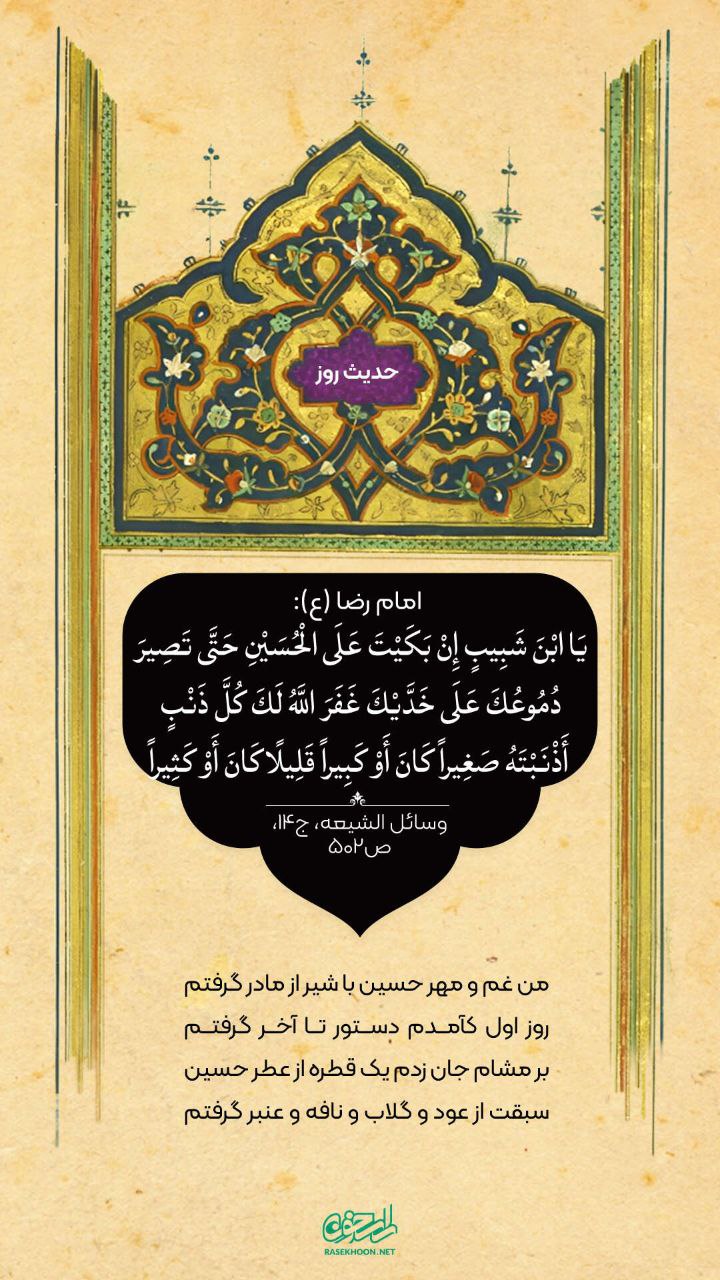 ای پسر شبیب! اگر بر حسین علیه السلام گریه کنی تا اینکه اشکهایت بر گونههایت جاری شود، خداوند گناهانی که مرتکب شدی، چه بزرگ و چه کوچک، چه کم و چه زیاد را میبخشد.