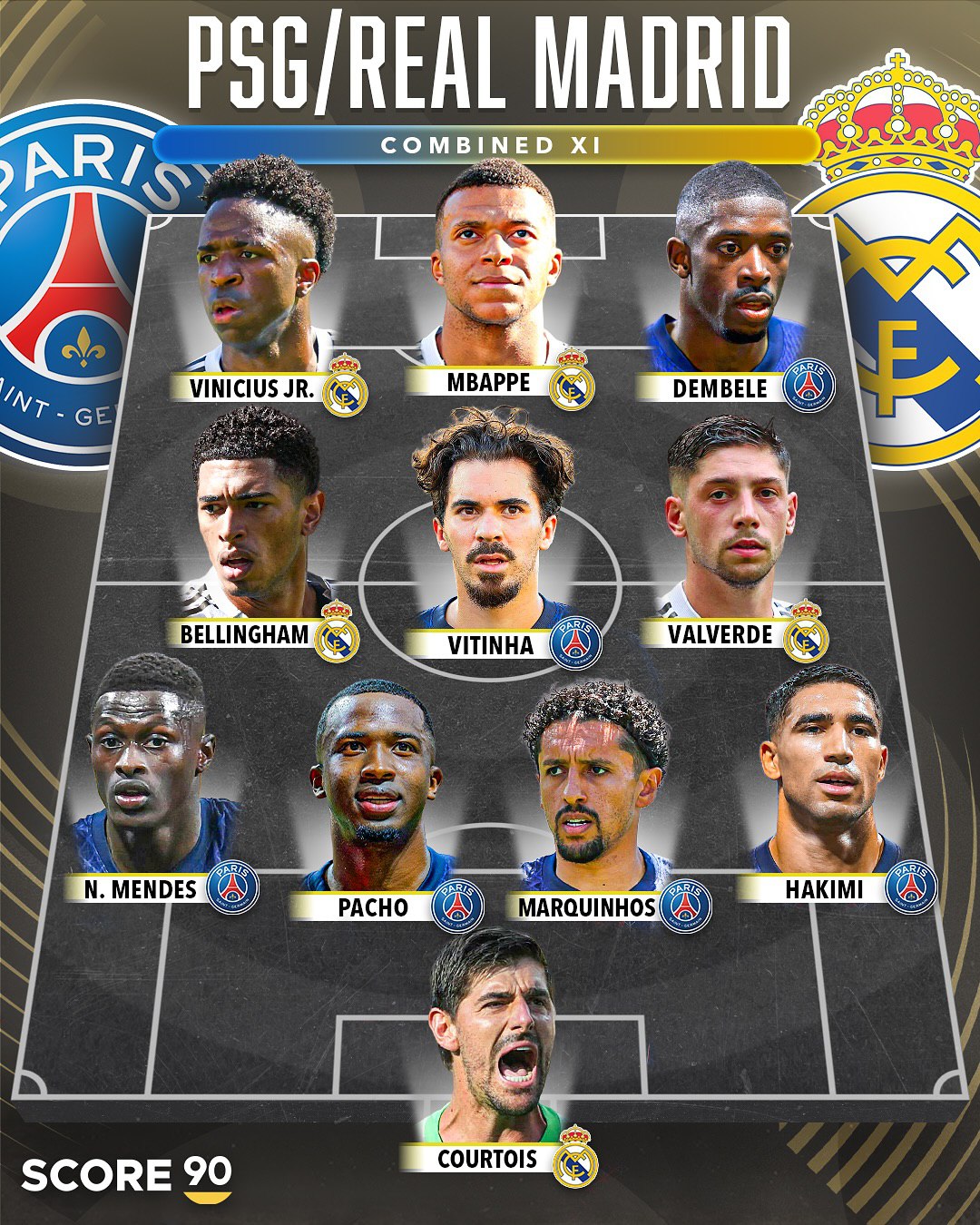 در طرح گرافیکی زیر که از سوی پلتفرم Score90 منتشر شده، تیبو کورتوا بالاتر از جانلوییجی دوناروما درون دروازه قرار گرفته است، اما هر چهار مدافع ترکیب، متعلق به پاری سن ژرمن هستند؛ البته این نکته را باید در نظر گرفت که ویلیان پاچو، مدافع اکوادوری پیاسجی، به دلیل دریافت کارت قرمز در جدال با بایرن مونیخ، قادر به بازی مقابل رئالیها نیست.