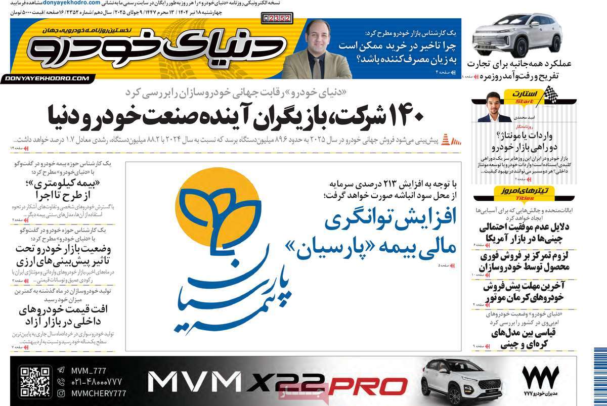 صفحه اول روزنامه دنیای خودرو چهارشنبه ۱۸ تیر