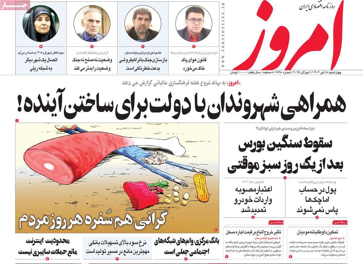 صفحه اول روزنامه امروز چهارشنبه ۱۸ تیر
