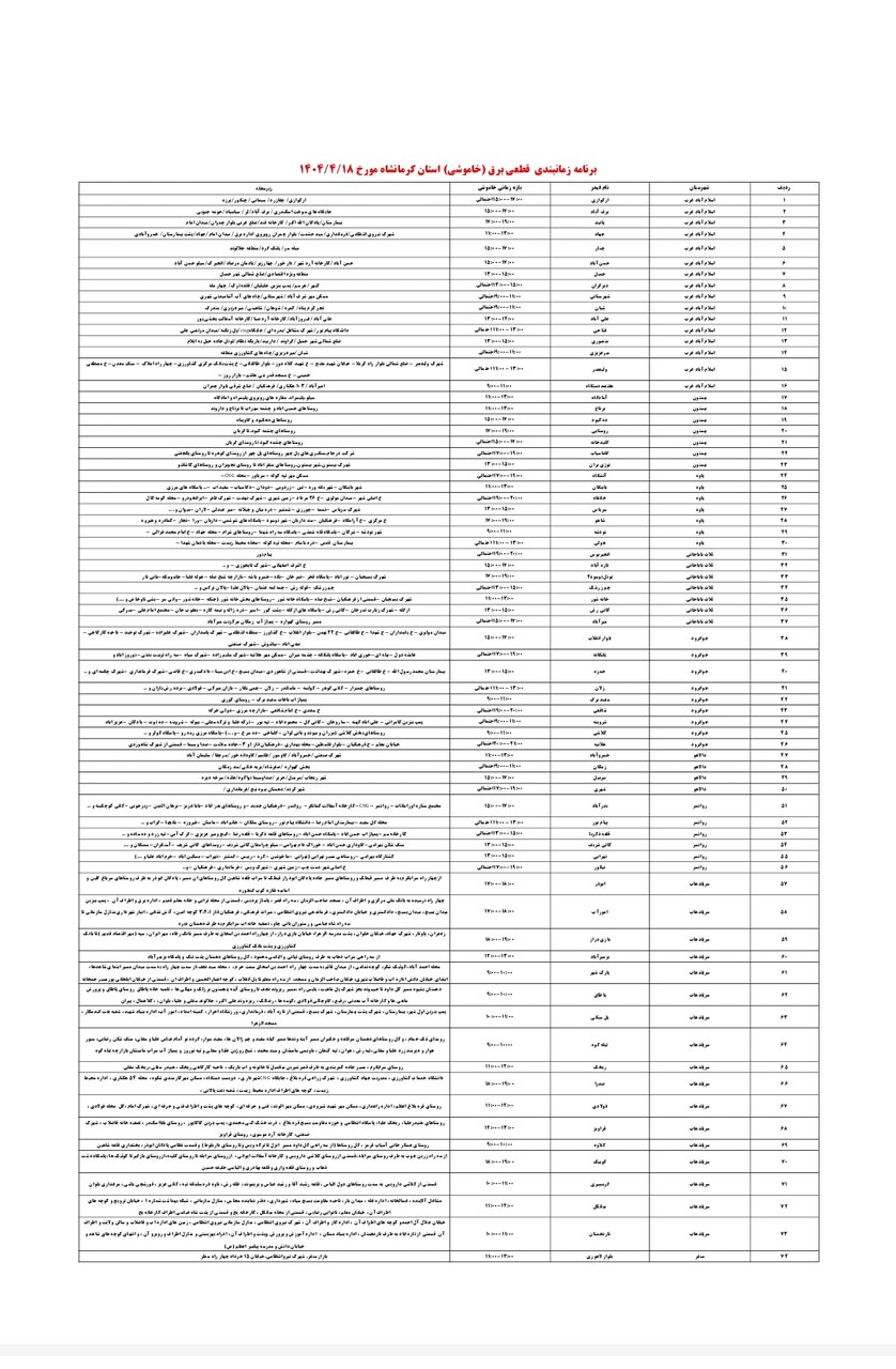 شرکت توزیع برق استان کرمانشاه طی جدولی، زمانبندی قطعی برق در مناطق مختلف استان کرمانشاه را برای امروز _چهارشنبه هجدهم تیر_ اعلام کرد.