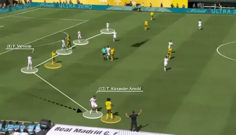 اما در سایر لحظات بازی الکساندر-آرنولد به پست اصلی خود در کناره زمین بازمیگشت تا کریم آدیِمی را دنبال کند؛ در این شرایط، والورده به مرکز زمین متمایل میشد تا فضاهایی را که دورتموند میتوانست از آنها استفاده کند، ببندد و جلوتر از مهاجمانی که در عمق حرکت میکردند، باقی بماند. این جابهجاییهای مداوم میان دو بازیکن، یک لایه دفاعی هوشمندانه و منعطف در جناح راست رئال مادرید ایجاد کرده بود.