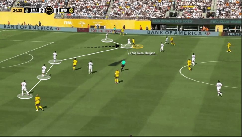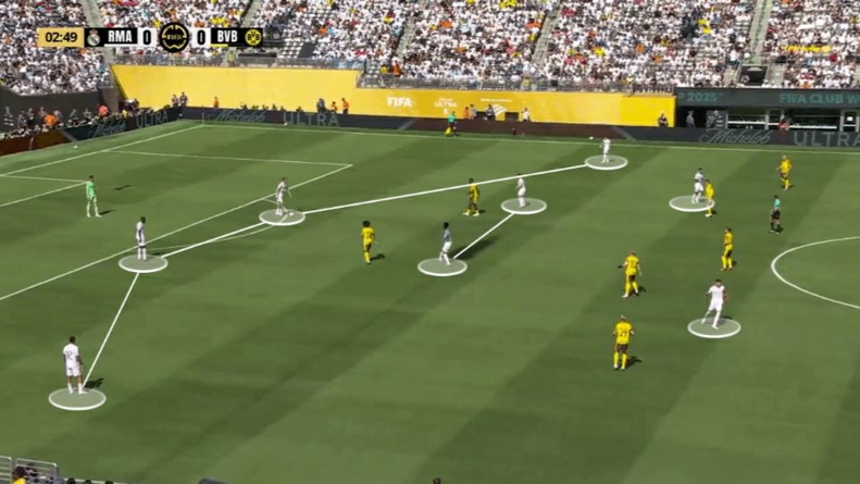 این تغییر باعث شد رئال بتواند توپ را هم بهصورت عرضی و هم مستقیم به گردش درآورد و ساختار دفاعی دورتموند را به چالش بکشد. در حالی که آردا گولر گاهی اوقات میان دو مدافع میانی رئال یا در موقعیت مدافع چپ قرار میگرفت تا فران گارسیا بتواند در پست بال چپ باقی بماند و به بازی رئال عرض بدهد، ساختار زیر نمونهای معمول از آرایشی بود که رئال بر اساس آن حمله میکرد.
