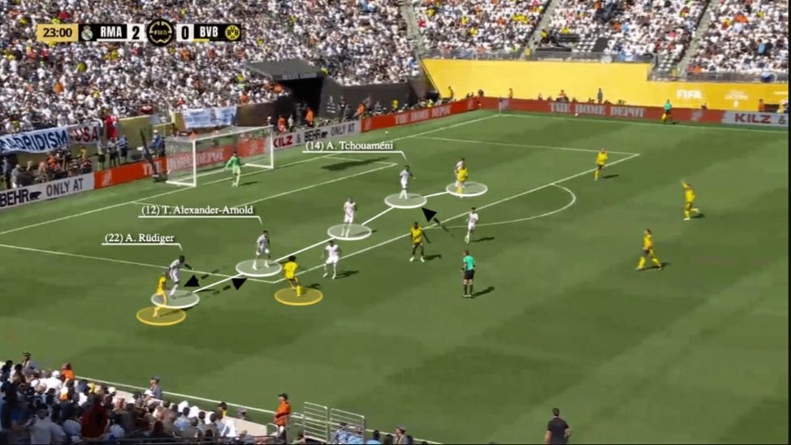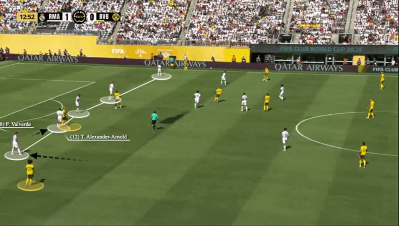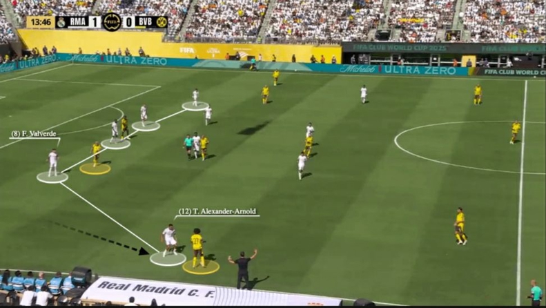 نمونهای عالی از همکاری هماهنگ میان الکساندر-آرنولد و والورده در نیمه دوم مشاهده شد: در حالی که الکساندر-آرنولد جلو رفت تا با اسونسون، وینگبک چپ دورتموند، مقابله کند، والورده به عقب رفت تا فضای خالی پشت سر را پوشش دهد و مسیر نفوذ فیلیکس انمِچا را که از عمق حرکت میکرد، ببندد. این حرکتات هماهنگ بیتردید به اندازه گلها و مهارهای دیدنی رئال مادرید، آلونسو را خشنود خواهد کرد.