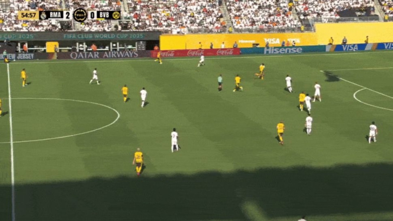 اما در سایر لحظات بازی الکساندر-آرنولد به پست اصلی خود در کناره زمین بازمیگشت تا کریم آدیِمی را دنبال کند؛ در این شرایط، والورده به مرکز زمین متمایل میشد تا فضاهایی را که دورتموند میتوانست از آنها استفاده کند، ببندد و جلوتر از مهاجمانی که در عمق حرکت میکردند، باقی بماند. این جابهجاییهای مداوم میان دو بازیکن، یک لایه دفاعی هوشمندانه و منعطف در جناح راست رئال مادرید ایجاد کرده بود.