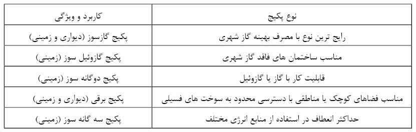 پکیج ها با توجه به نوع مصرف انرژی، در دسته های مختلف زیر طبقه بندی می شوند: