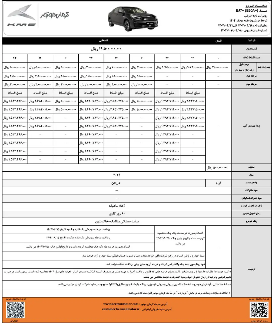 / بر اساس جدیدترین بخشنامه فروش کرمان موتور، سدان برقی این شرکت به صورت نقد و اقساط ویژه تیر ۱۴۰۴ به فروش می رسد.
