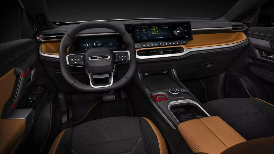 دیگر ویژگیهای داخلی این مدل شامل سطوح ضدخش روی پشتی صندلیهای عقب است که برای حمل حیوانات خانگی یا تجهیزات پیکنیک ایدهآل هستند. کابین همچنین محفظههای اشیاء بیشتری دارد و کفپوشهای لاستیکی آن برای مقاومت در برابر گل، شن و آب طراحی شدهاند. از نظر ظاهری هم کابین با تزئینات بژ روی داشبورد، درها و صندلیها که با جزئیات قرمز ظریف همراه شدهاند، رویکردی کاربردیتر دارد. جیپ میگوید تریم رنگی خاکیمانند این کابین، کثیفی را در طول زمان بهتر پنهان میکند. صفحه آمپر دیجیتال 10 اینچی و نمایشگر سیستم اطلاعاتی-سرگرمی 16 اینچی بهصورت استاندارد ارائه میشوند.