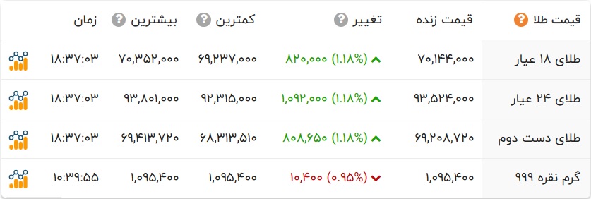 در بازار نرخ هر گرم طلای 18 عیار با 82 هزار تومان افزایش و با نرخ هفت میلیون و 14 هزار تومان در بازار طلا معامله شد. سکه امامی با یک میلیون تومان افزایش به 78 میلیون و 150 هزار تومان قیمت گذاری شد. سکه بهار آزادی با 190 هزار تومان افزایش به 70 میلیون و 600 هزار تومان رسید. نرخ نیم سکه و ربع سکه به ترتیب 42 میلیون و 460 هزار تومان و 24 میلیون و 960 هزار تومان در تابلو اعلان قیمتها نمایان شد.