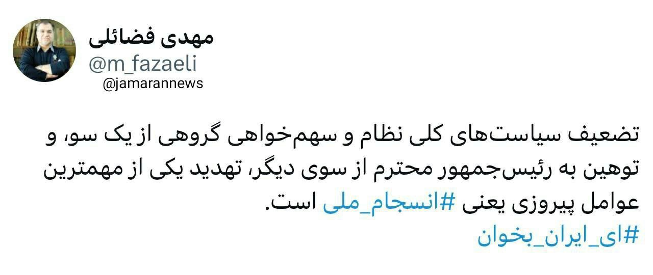 میزان/ عضو دفتر حفظ و نشر آثار رهبر انقلاب نوشت: تضعیف سیاستهای کلی نظام و سهمخواهی گروهی از یک سو و توهین به رئیسجمهور محترم از سوی دیگر، تهدید یکی از مهمترین عوامل پیروزی یعنی انسجام ملی است.