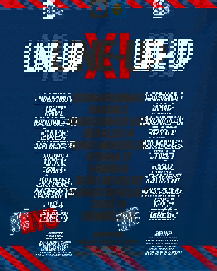 ترکیب پاری سن ژرمن: دوناروما، حکیمی، مارکینیوش، برالدو، مندس، روئیز، ویتینا، ژوائو نوس، دزیره دوئه، دمبله، کواراتسخلیا