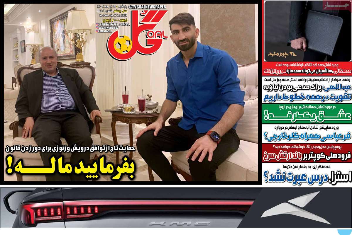 صفحه اول روزنامه گل پنجشنبه ۱۹ تیر