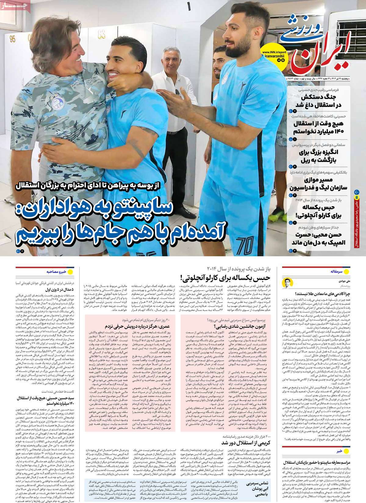 صفحه اول روزنامه ایران ورزشی پنجشنبه ۱۹ تیر