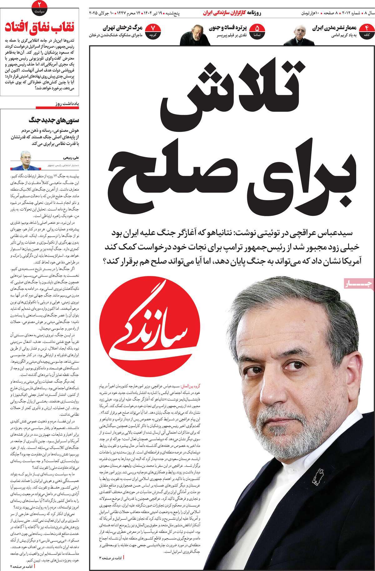 صفحه اول روزنامه سازندگی پنجشنبه ۱۹ تیر