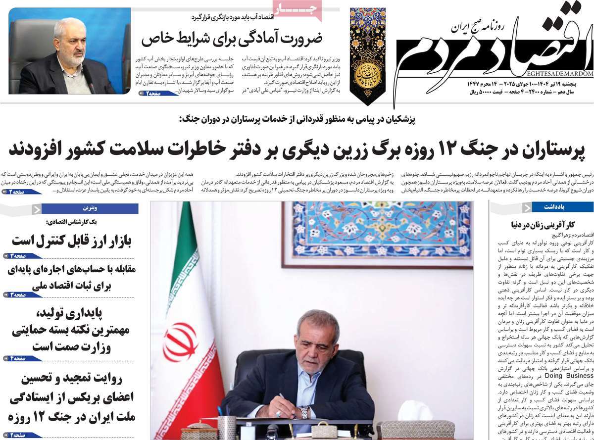 صفحه اول روزنامه اقتصاد مردم پنجشنبه ۱۹ تیر