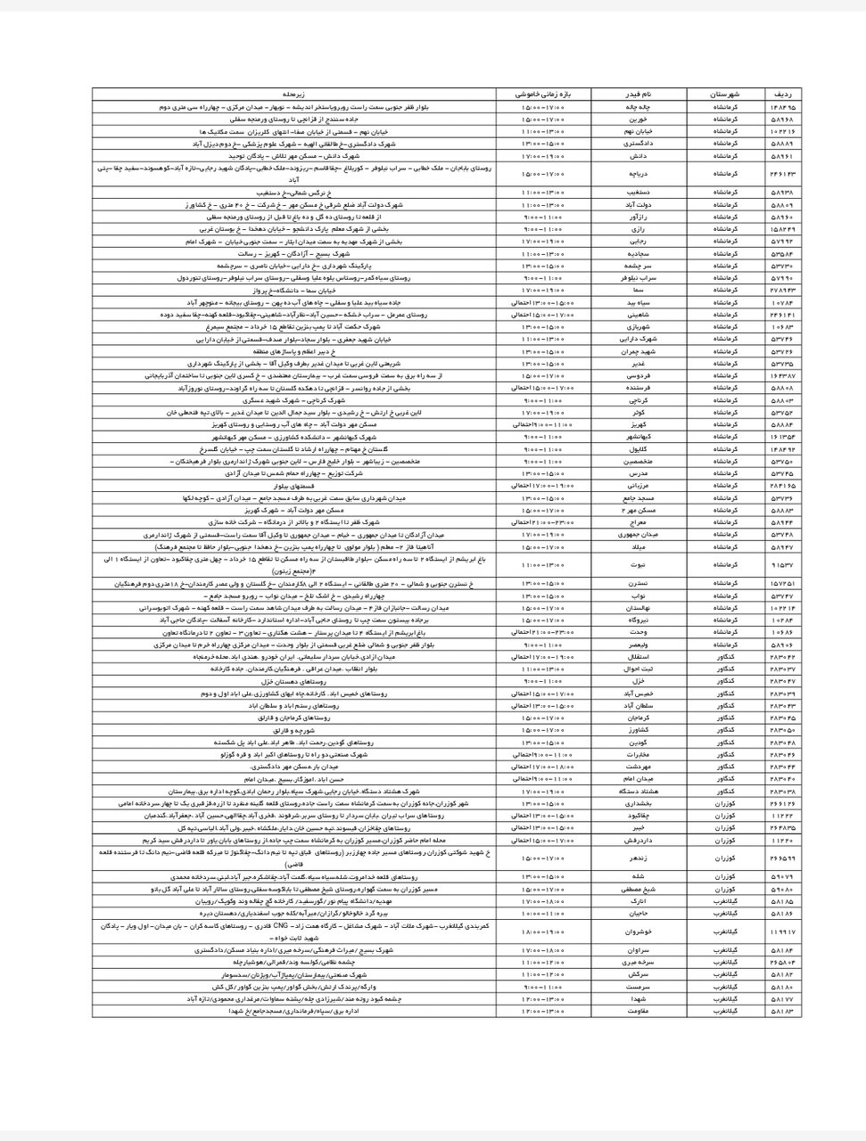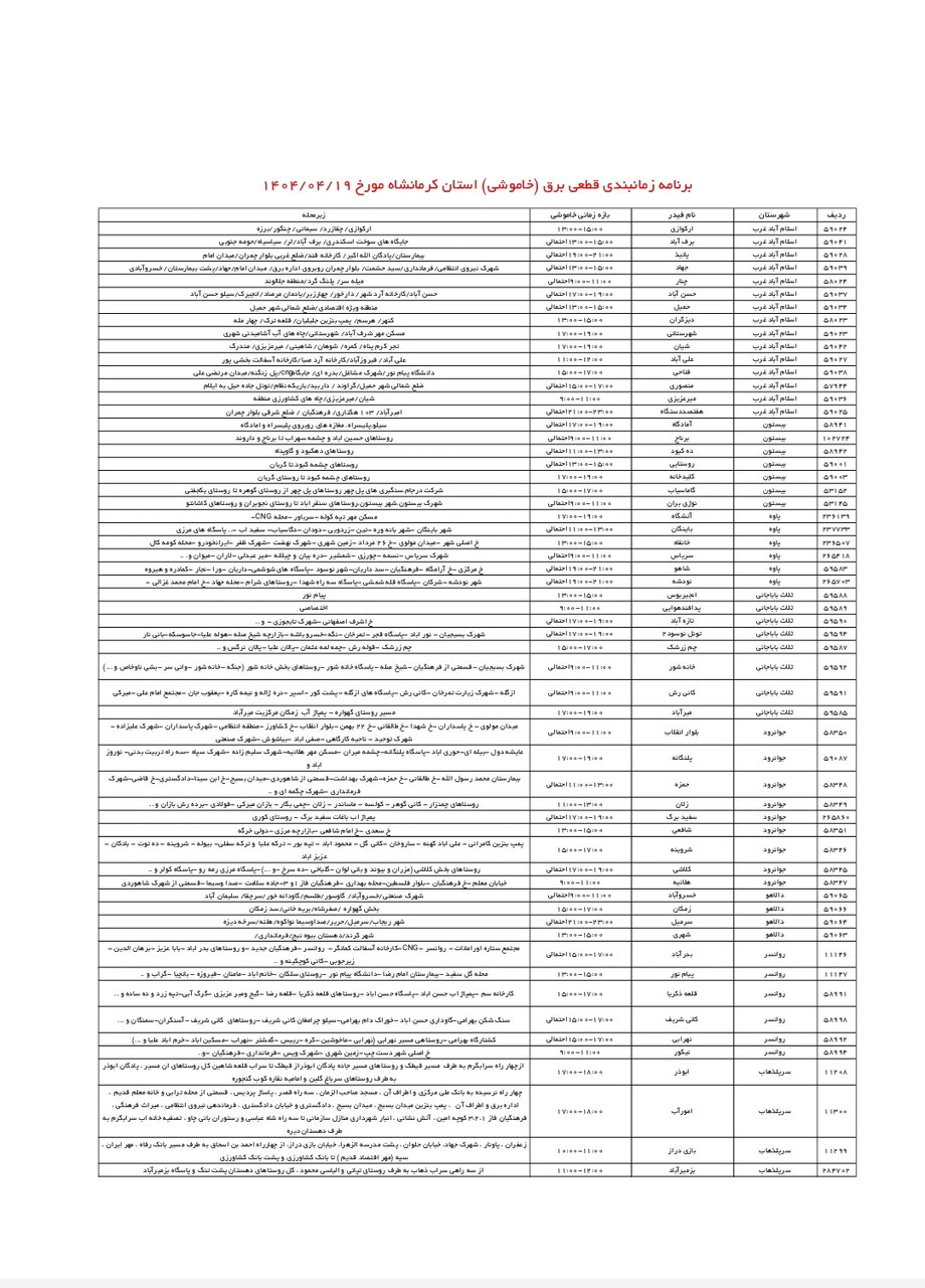 شرکت توزیع برق استان کرمانشاه طی جدولی، زمانبندی قطعی برق در مناطق مختلف استان کرمانشاه را برای امروز _ پنجشنبه نوزدهم تیر_ اعلام کرد.