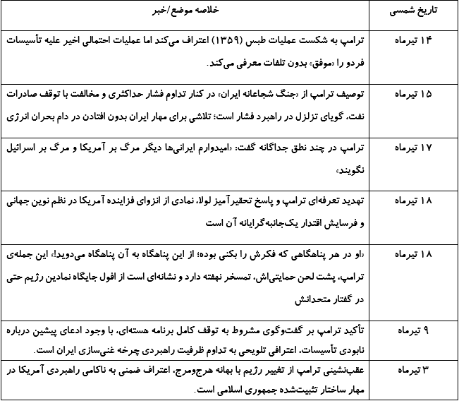 مجموعه این مواضع، بهوضوح نشان میدهد که گفتمان ترامپ در برابر ایران، در حال عبور از مرحله تهدید و فشار مطلق به مرحلهای از اعترافات تلویحی، بازتعریف تاکتیکها و تلاش برای حفظ پرستیژ بدون هزینه است. این روند، نه از موضع قدرت، بلکه محصول نوعی فرسایش تدریجی در راهبردهای سختافزاری آمریکا در برابر ایران است که خود را در قالب سخنان متناقض، ادعاهای مبهم و طنزهای غیرمستقیم بازنمایی میکند.